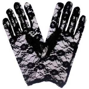 Black lace gloves. Use these gloves to finish off a Madonna costume, or for an 80s theme costume. These gloves are fairly stretchy, and should fit most adult hands. These fingerless lace gloves are also available in white.