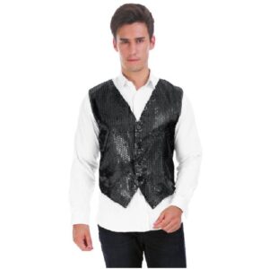 Black Sequin Vest. This vest is a great staple item for any costume box. Use for Christmas, New Year’s, Gatsby, Roaring 20’s, fifties, rock n roll and many other themes. This vest is marked as a one size fits most. Also available in silver or gold.