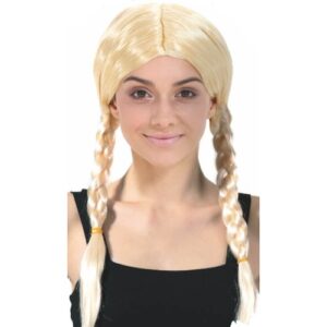 Blonde Plaited Wig. This pre-plaited wig is ideal for many themes. Use for an Oktoberfest, Viking, or Barbie themed costume. This wig is also available in black. These wigs are on an elastic netting, so should fit most adult heads.