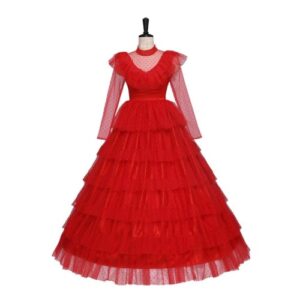 Lydia Deetz Red Wedding Dress – FOR HIRE. Lydia Deetz, from Tim Burton’s Beetlejuice (1988 & 2024), is a great costume choice for many themes. Use her for Halloween, Hollywood, movie, Tim Burton, or iconic themed events. Hire also includes a veil and a wig.