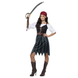 Pirate Deckhand. This ladies pirate costume is ideal for your next swashbuckling shindig. Use for a pirates, under over or by the sea, nautical, or around the world themed event. This pack includes shirt, mock waistcoat, skirt, belt and bandana.