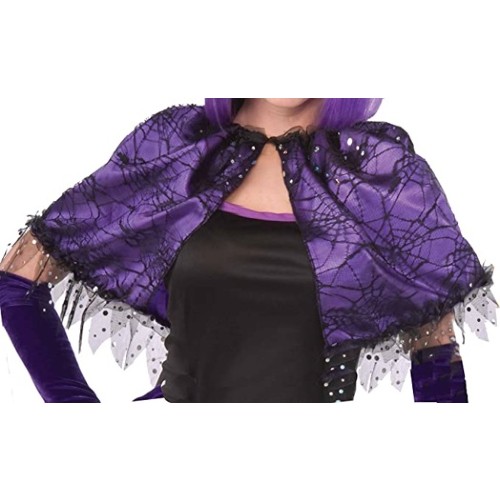 Purple and black witchy capelet. This purple and black capelet is ideal for a witches costume. The black lace has a spiderweb detail, making it perfect to pair with a black witches dress. You could also add a matching black and purple witches hat.