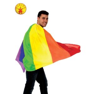 Rainbow cape. Use this waist length cape to stand out in the crowd at pride events or for festivals. Could also use as an accessory for school events, Mardi Gras, or rainbow themed parties. Tie fastener at neck.