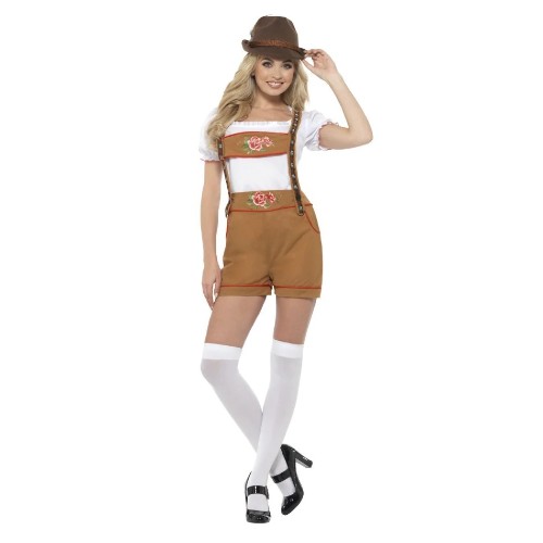Sexy Bavarian beer girl Oktoberfest costume. This adorable set of brown lederhosen and white shirt is perfect for your trip to Oktoberfest. Includes brown lederhosen shorts and shirt. Hat and socks sold separately. Just plait your hair and grab a pretzel.